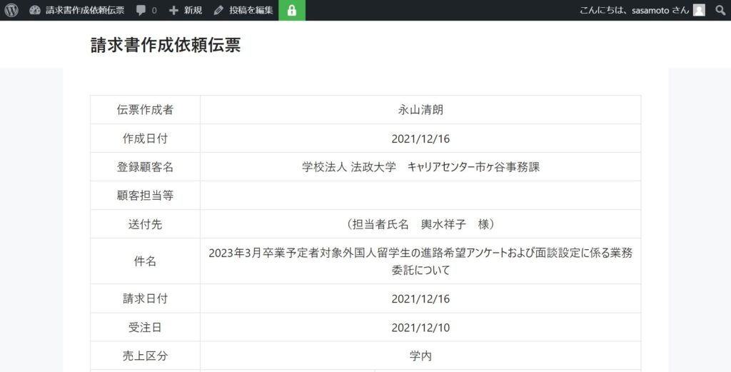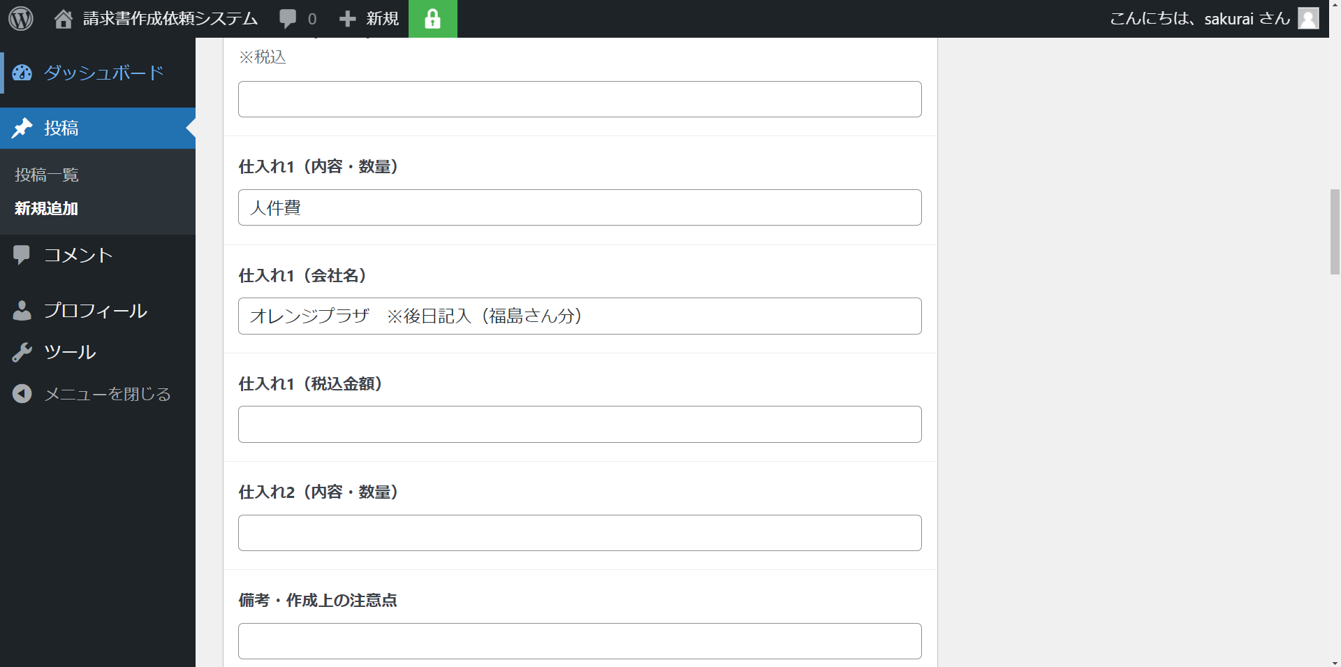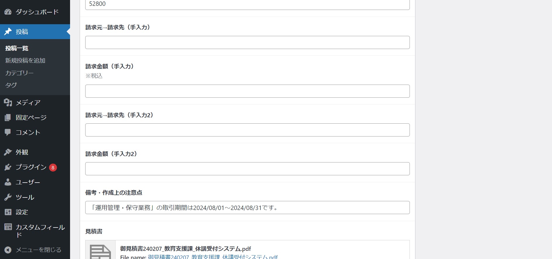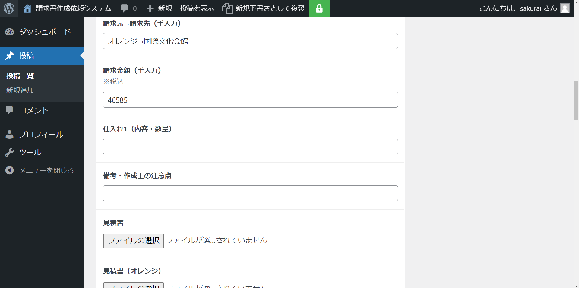 学外の案件など、請求元や請求先について手入力が必要な場合には、「請求元→請求先(手入力)」「請求金額(手入力)」の欄をセットで入力してください。
