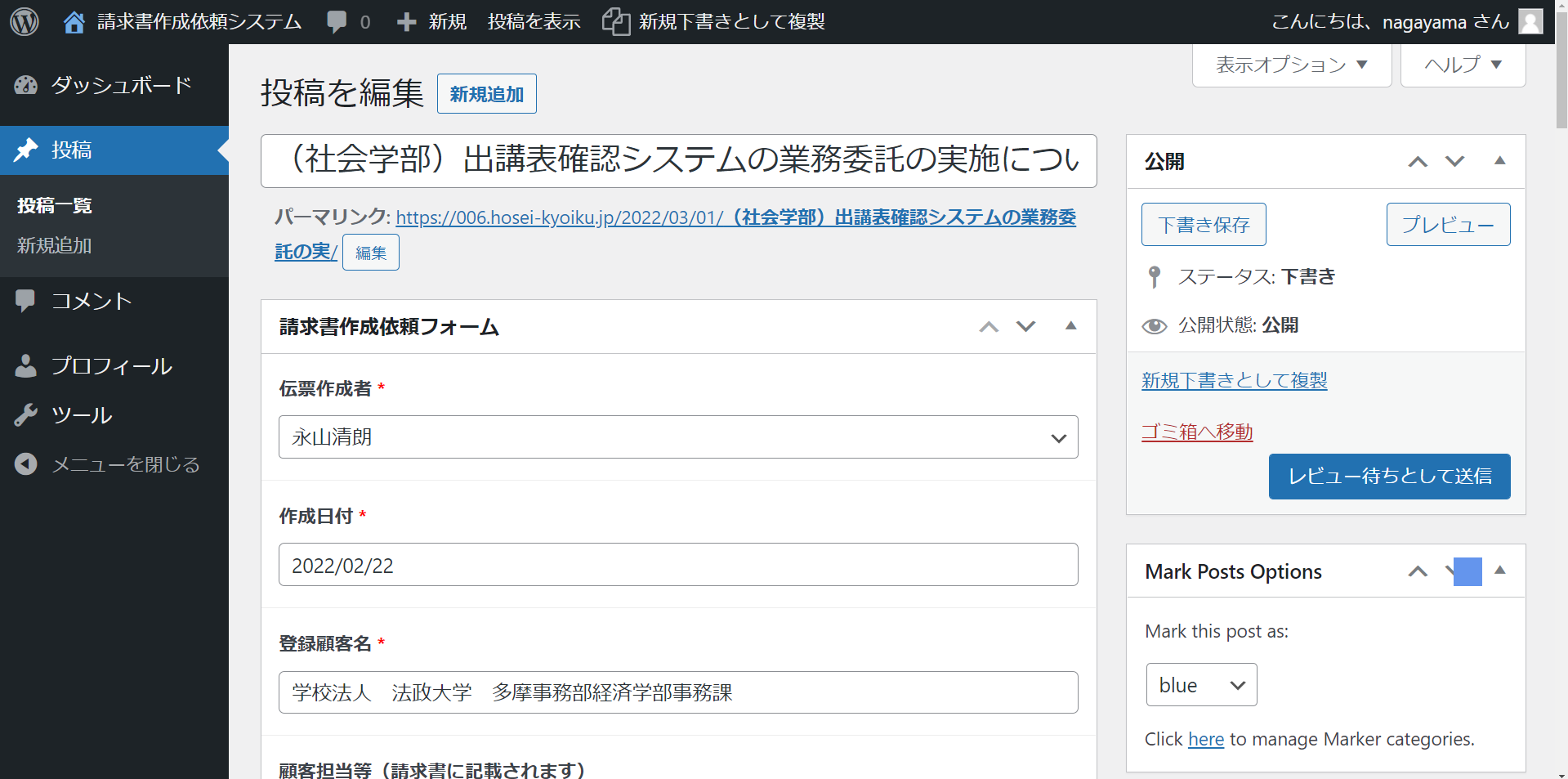 すでに請求書発行済のものを下敷きにした場合、右枠もしくは最下部の「Mark Posts Options」のプルダウンが「orange」になっているはずなので、「blue」に変更します。